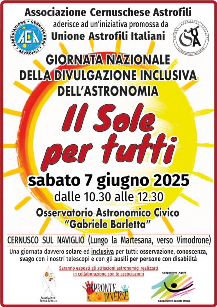 L’Associazione Cernuschese Astrofili aderisce alla “Giornata nazionale della divulgazione inclusiva dell’Astronomia”, iniziativa dell’Unione Astrofili Italiani nata per diffondere il tema dell’inclusione sociale anche agli aspetti divulgativi scientifici.
