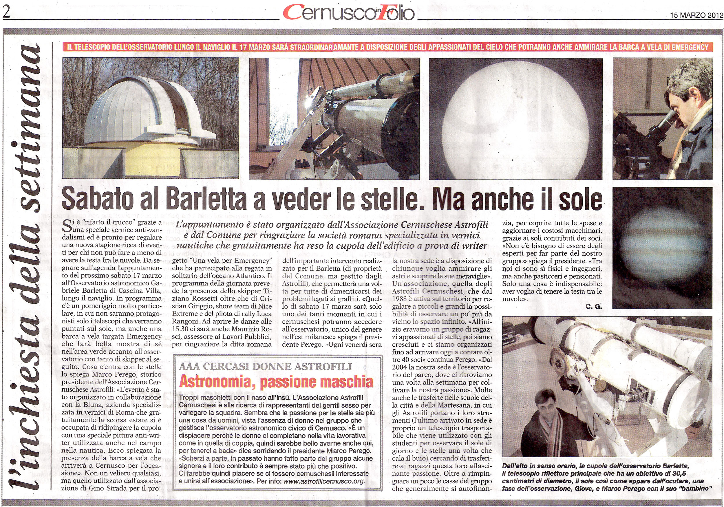 Si è “rifatto il trucco” grazie a una speciale vernice anti-vandalismi ed è pronto per regalare una nuova stagione ricca di eventi per chi non può fare a meno di avere la testa fra le nuvole. Da segnare sull’agenda l’appuntamento del prossimo sabato 17 marzo all’Osservatorio astronomico Gabriele Barletta di Cascina Villa, lungo il naviglio. In programma c’è un pomeriggio molto particolare, in cui non saranno protagonisti solo i telescopi che verranno puntati sul sole, ma anche una barca a vela targata Emergency che farà bella mostra di sé nell’area verde accanto all’osservatorio con tanto di skipper al seguito.
