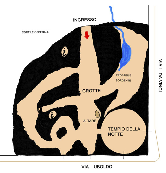 Attraverso «l’antro di Enea e Didone» che fungeva da vestibolo, si accedeva ai sotterranei «ad imitazione di grotte naturali». Attualmente i sotterranei sono inagibili in quanto pericolanti, per la loro ricostruzione dobbiamo quindi basarci sulla descrizione sopra citata. «Originale e ben studiato è l’organismo di queste grotte, sia nel tenebroso tratto a labirinto… come nei vani dalle fantastiche volte… con spiragli da cui piovono obliqui fasci di luce. Alla sensazione di orrido si aggiunge la voce del… ruscelletto che qui scorre lungo il camminamento pel quale si giunge infine al Tempio della Notte. È questo un ampio e squallido vano a rotonda con volta emisferica e colonne abbozzate ed abbinate che lo circondano attorno alla rustica parete intercalata da nicchie e finestre». Esaltava questa atmosfera tra l’orrido e il raccapricciante anche il «ponte del diavolo» un ponte di legno, oscillante su catene, posto sulle pendici della «montagnola» costituita da un rialzo in terra di riporto. Il movimentare il terreno pianeggiante per mezzo di riporti di terra è un’altra delle caratteristiche peculiari dei giardini romantici.