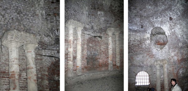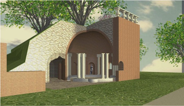 Struttura circolare con muratura in mattone rosso avente un diametro di circa 7,50 mt. sovrastata da una volta semi sferica sempre in mattoni pieni. Lungo la circonferenza sono presenti 4 aperture di cui una cieca, orientate secondo i punti cardinali est sud ovest nord. Ad individuare i punti intermedi tra i vari punti cardinali sono state collocate della loggie che con buona probabilità ospitavano delle statue, mentre coppie di colonne sovrastare da un rudere di architrave individuano gli ulteriori punti intermedi.