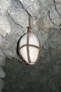 In questa immagine troviamo una delle tante simbologie che il Tempio della notte racchiude nel suo scrigno di segreti l’uovo appeso al soffitto. L’Uovo in particolare, è un simbolo di Athanor, il crogiuolo utilizzato dagli alchimisti dove avviene la trasformazione della materia, il suo significato è legato soprattutto al congiungimento delle due sostanze principali per l’alchimia, lo zolfo legato all’uomo e al Sole e il mercurio alla donna e alla Luna. Una simbologia simile legata all’uovo come icona della nascita, la possiamo trovare nella Pala di Brera, di Piero della Francesca, con riferimento alla verginità di Maria, si riteneva che l’uovo appeso venisse fecondato dal Sole (Dio) senza il bisogno di un intervento maschile Lungo le pareti e il soffitto troviamo dei fori aventi diametro poco più di una mela, che avevano il compito di far filtrare la luce del Sole ricreando suggestivi giochi di luce all’interno del buio delle grotte. Con buona probabilità la loro posizione era calcolata astronomicamente in base alla posizione del Sole e della Luna.