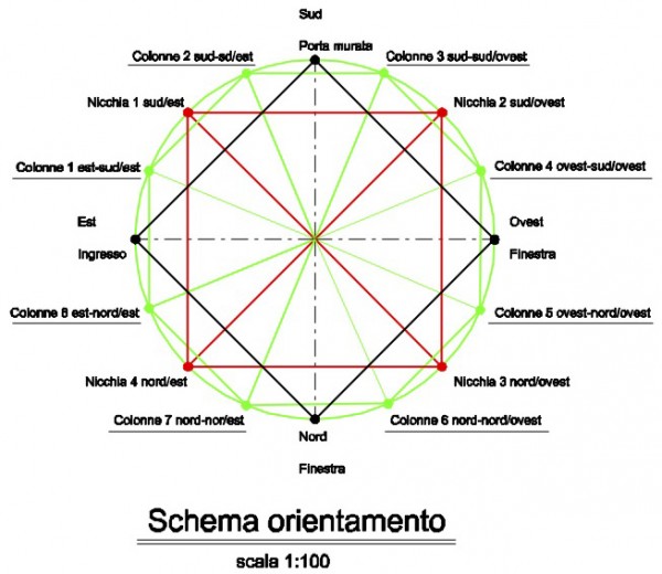 Le misure successive hanno mostrato come elementi interni del tempietto (nicchie e colonne) siano poste con estrema precisione ad indicare anche la linea NORD-SUD e tutte le 12 posizioni intermedie (ogni 22,5 gradi) tipiche ad esempio della rosa dei venti.