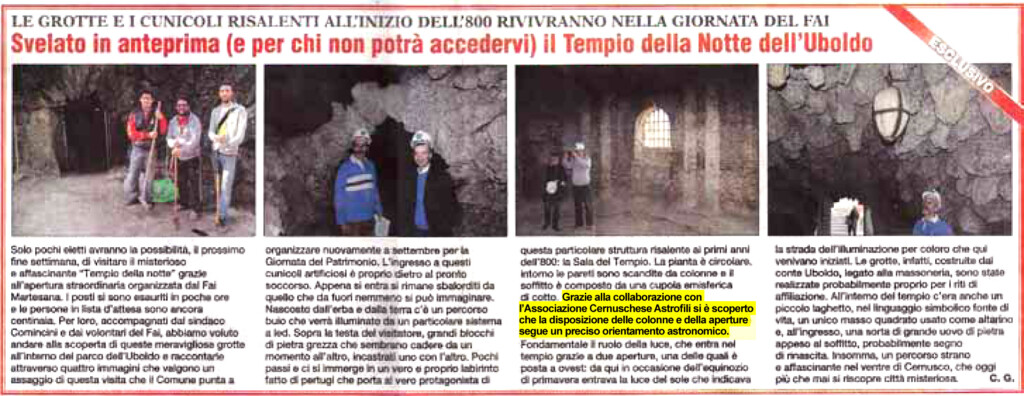 Grazie alla collaborazione con l’Associazione Cernuschese Astrofili si è scoperto che la disposizione delle colonne e delle aperture segue un preciso orientamento astronomico. Fondamentale il moto della luce, che entra nel tempio grazie a due aperture, una delle quali è posta a ovest: da qui in occasione dell’equinozio di primavera entrava la luce del sole che indicava la strada dell’illuminazione per coloro che qui venivano iniziati. Le grotte, infatti, costruite dal conte Uboldo, legato alla massoneria, sono state realizzate probabilmente proprio per i riti di affiliazione. All’intemo del tempio c’era anche un piccolo laghetto, nel linguaggio simbolico fonte di vita, un unico masso quadrato usato come altarino e, all’ingresso, una sorta di grande uovo di pietra appeso al soffitto, probabilmente segno di rinascita. insomma, un percorso strano e affascinante nel ventre di Cernusco, che oggi più che mai si riscopre città misteriosa.