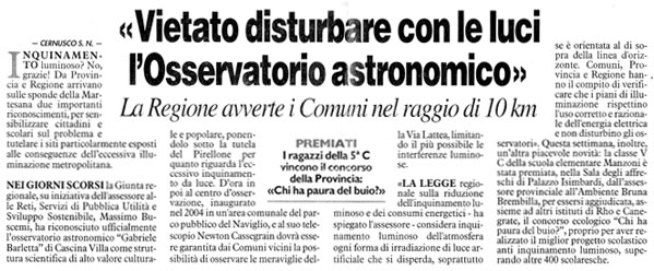 Nei giorni scorsi la Giunta regionale, su iniziativa dell’assessore alle Reti, Servizi di pubblica utilità e Sviluppo sostenibile, Massimo Buscemi, ha riconosciuto ufficialmente l’Osservatorio astronomico “Gabriele Barletta” di Cascina Villa come struttura scientifica di alto valore culturale e popolare, ponendolo sotto la tutela del Pirellone per quanto riguarda l’eccessivo inquinamento da luce. D’ora in poi al centro di osservazione, inaugurato nel 2004 in un’area comunale del Parco pubblico del Naviglio, e al suo telescopio Newton Cassegrain dovrà essere garantita dai comuni vicini la possibilità di osservare le meraviglie della Via Lattea, limitando il più possibile le interferenze luminose.